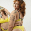 Calcinha Amalfi: fio dental em renda amarela vibrante com delicada barra em azul‑escuro e lacinho frontal. Leve, sensual e perfeita para o calor.