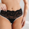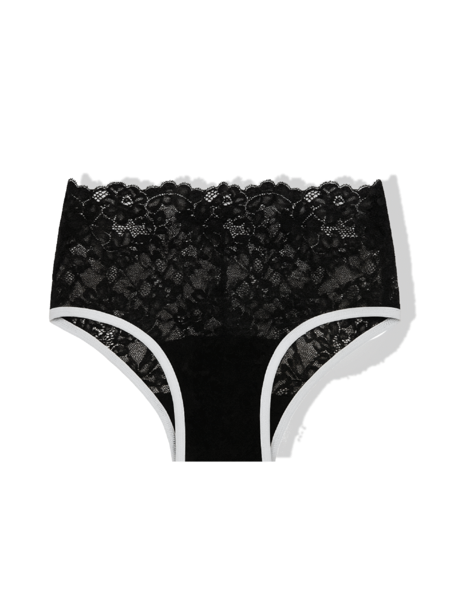 Calcinha em renda preta com cintura elevada e detalhes contrastantes em branco. Confortável e moderna.