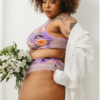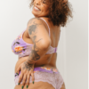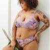 Modelo fio dental em malha geladinha com estampa floral e fundo lilás, combinada com renda floral lilás. Conforto e sensualidade em uma peça que exala elegância