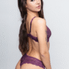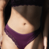 Calcinha fio em malha geladinha roxa com detalhes em renda. Sensualidade com conforto em uma peça vibrante.