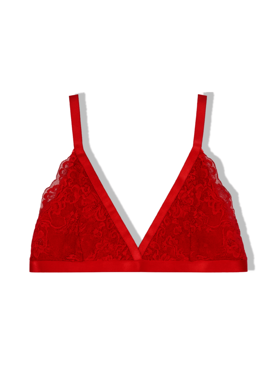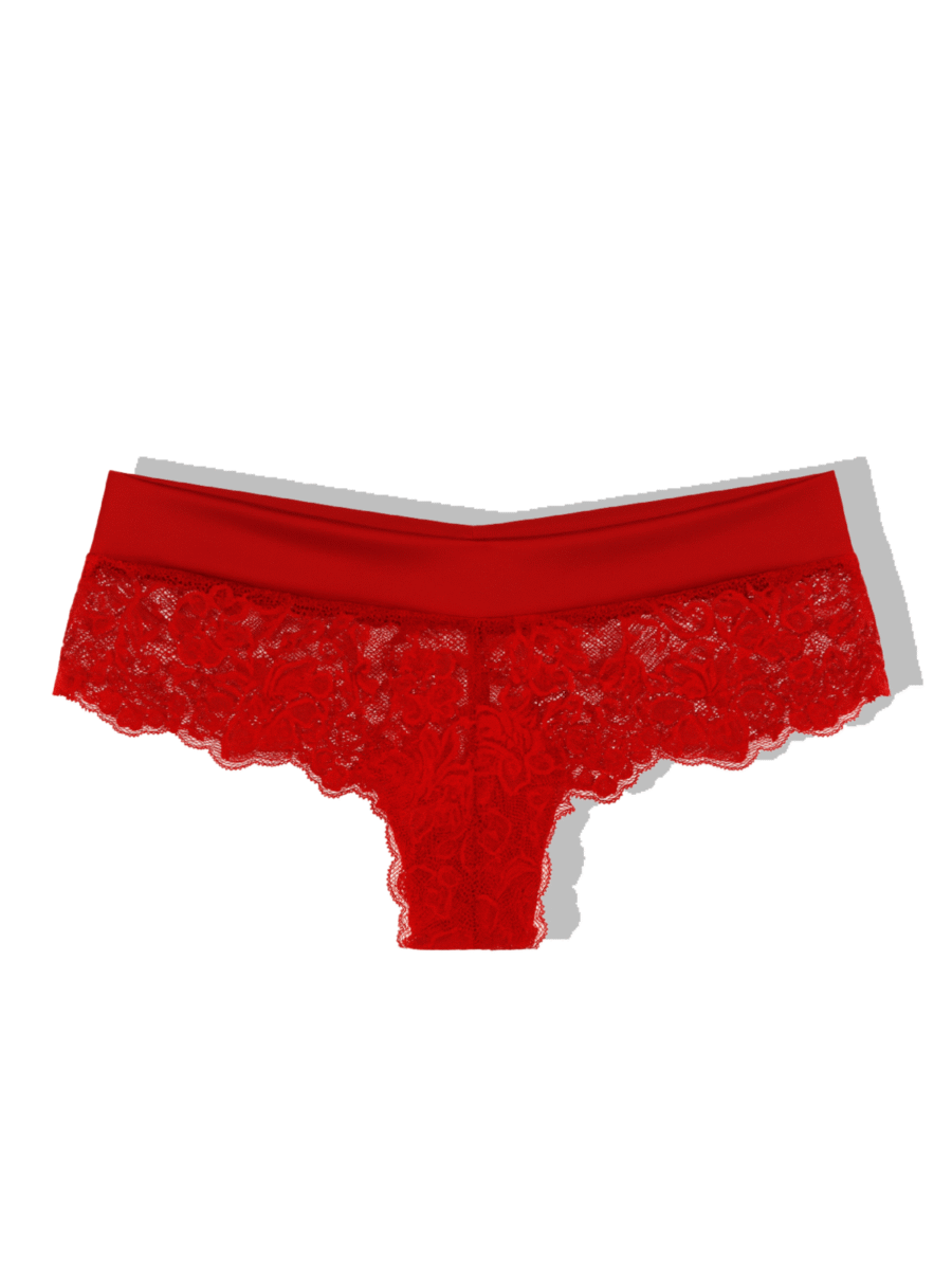 Renda vermelha com painel em malha acetinada e laterais médias. Sensual, confortável e versátil, com transparências estratégicas.