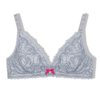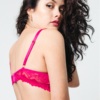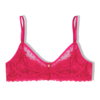 Sutiã em renda pink com recortes em tule de corações, sem bojo e sem aro. Alças com reguladores dourados e lacinho central com medalhinha Pitaya.