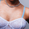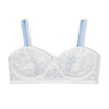 Sem bojo e sem aro, com base em renda branca 3D e alças azul claro. Pingente central inspirado no diamante para brilho sutil. Faz conjunto com as calcinhas Aliança e Diamante.