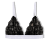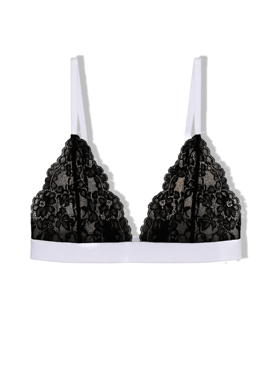 Sutiã triangular em renda preta premium de alto relevo, sem bojo e sem aro com base confortável de elástico revestido em branco. Conjunto com Órbita e Eclipse.
