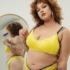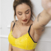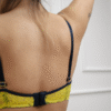 Sutiã Positano: compõe conjunto com as Calcinhas Positano e Amalfi. Renda premium amarela com detalhes azuis, confortável e com ótimo suporte.