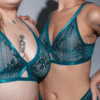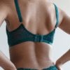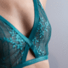 Sutiã em renda esmeralda floral, forro de tule para sustentação e cruzamento frontal estiloso. Conjunto com Quartzo e Cristal.